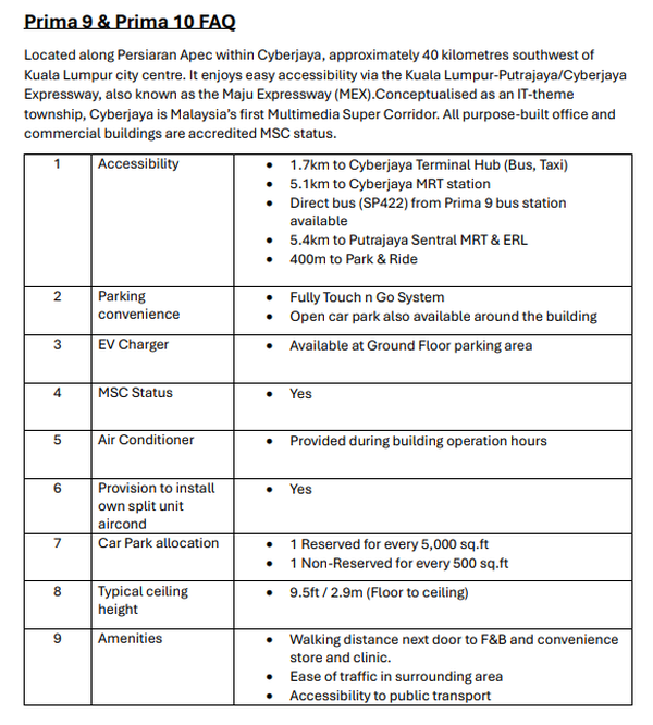Prima 10 is Located along Persiaran Apec within Cyberjaya, approximately 40 kilometers southwest of Kuala Lumpur city centre. It enjoys easy accessibility via the Kuala Lumpur-Putrajaya/Cyberjaya Expressway, also known as the Maju Expressway (MEX). Conceptualized as an IT-theme township, Cyberjaya is Malaysia’s first Multimedia Super Corridor. All purpose-built office and commercial buildings are accredited MSC status.